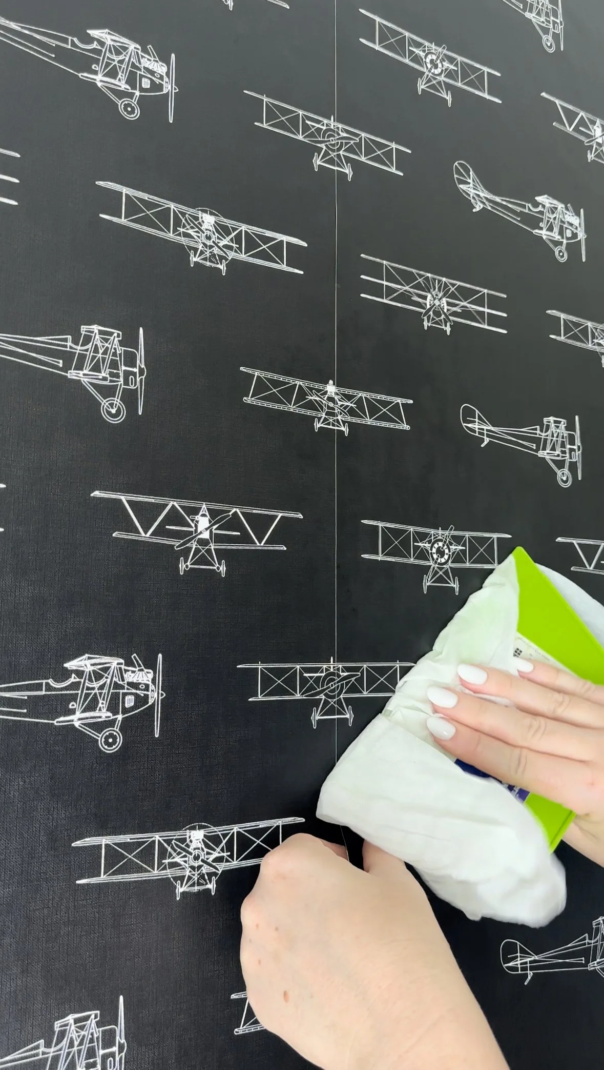 This antique airplane wallpaper from Spoonflower is super high quality, which makes it very easy to install. Since it was such a dark color, they asked to wallpaper just one wall, opposite the crib. Keep reading for my tips on how to hang peel and stick wallpaper to kickstart your own travel-themed nursery!